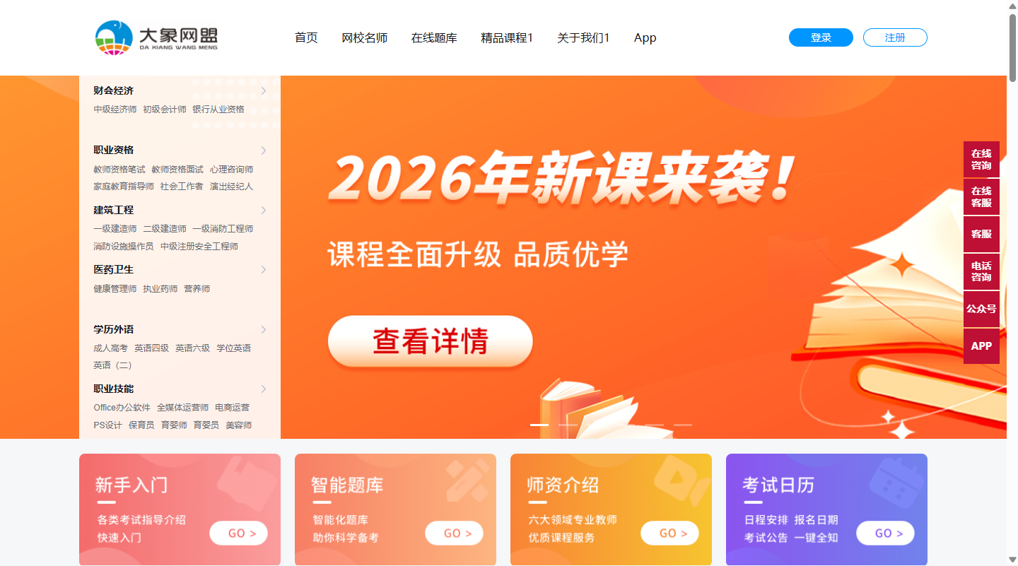 无需机构自行研发课程,大象网盟整合了六大核心板块的刚需课程,覆盖职业教育热门赛道:财经类(初/中级会计师、银行从业资格)、建筑工程类(一/二级建造师、消防工程师)、学历语言类(成人高考、英语四六级)、职业资格类(教师资格证、心理咨询师)、医药健康类(执业药师、健康管理师)、技能提升类(电商运营、Python编程)。