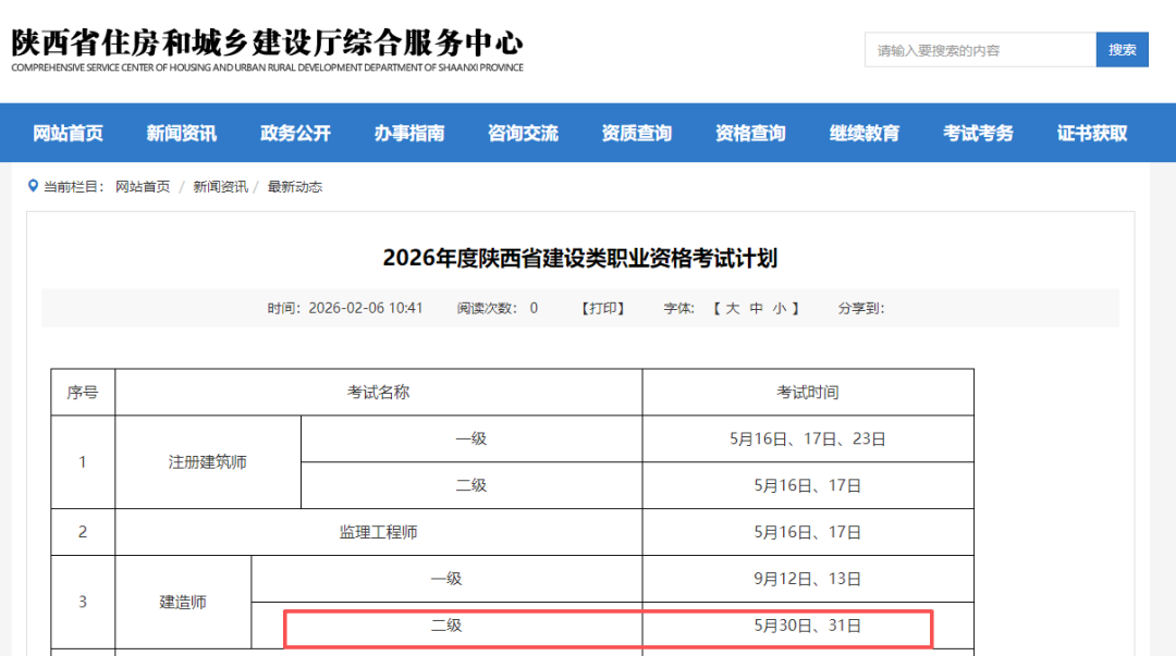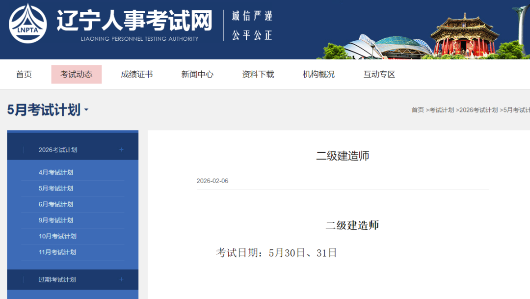 辽宁人事考试网于2月6日更新2026年5月专业技术人员资格考试计划,在考试安排清单中,直接标注二级建造师考试日期为5月30日、31日。