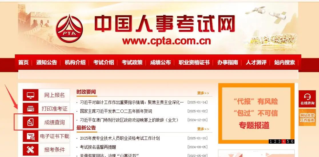 访问中国人事考试网(点击进入),在左侧导航菜单中选择“成绩查询”栏目。