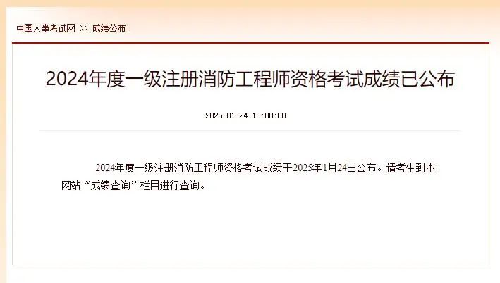 好消息!2024年度一级注册消防工程师资格考试成绩已于1月24日公布。广大考生们,是时候揭晓你的努力成果了!以下是查询成绩及相关事宜的详细指南: