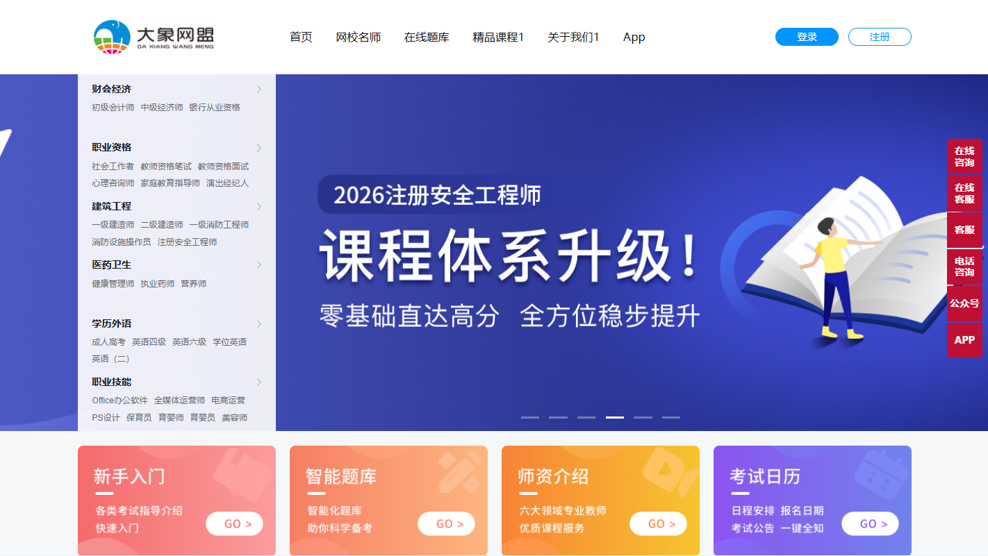 备考找对方向很重要,有专业的平台支撑更能事半功倍。针对2026注安教材大改的备考需求,大象网盟专属网校平台已完成全面搭建,从课程、题库到答疑,打造一站式备考服务,帮你避开误区、精准发力。